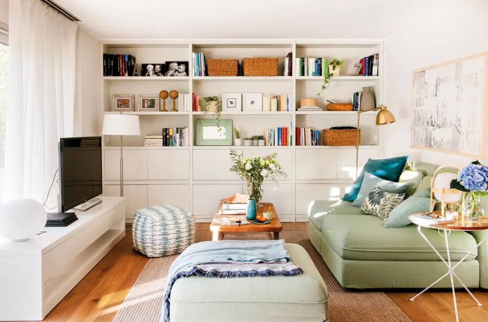 Los muebles ideales deben ser tanto funcionales como estéticamente agradables. Por ejemplo, una mesa de centro con almacenamiento oculto no solo es práctica para guardar objetos, sino que mantiene el espacio ordenado y elegante. Los estantes abiertos, además de ofrecer espacio de almacenamiento, pueden servir como elementos decorativos al exhibir libros, plantas o recuerdos.